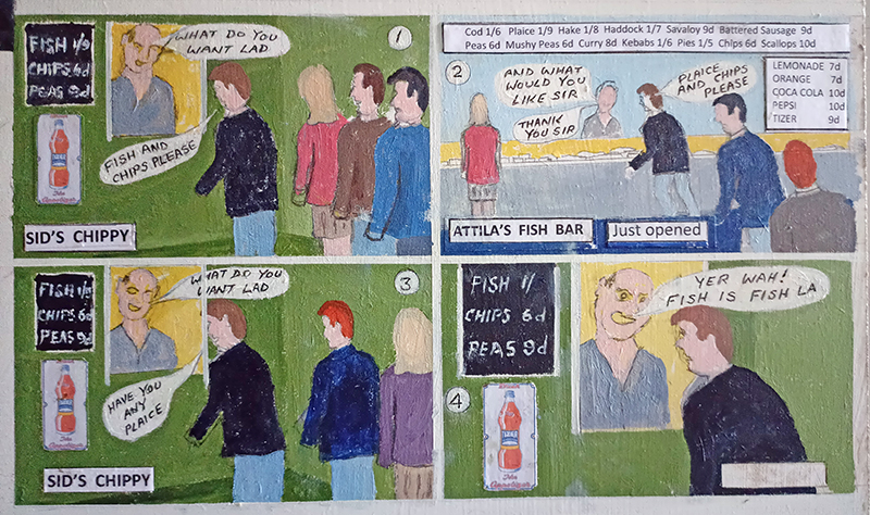 My illustration shows such the chippy revolution experience of mine with such a basic chippy near Garston and a newly opened chippy in Aigburth.